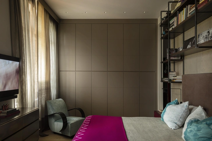 Комод и книжные полки изготовлены на заказ по дизайну Pelizzari Studio. Винтажное кресло переобтянуто тканью Designer Guild.