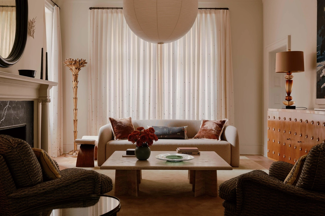 Гостиная. Светильник Noguchi Lantern, Huge Collective. Винтажное зеркало, RT Facts. Диван Ondé, RH. Ткань дивана, Lauren Mishaan. Журнальный столик из травертина. Мохеровый ковер на заказ, Chused & Co.