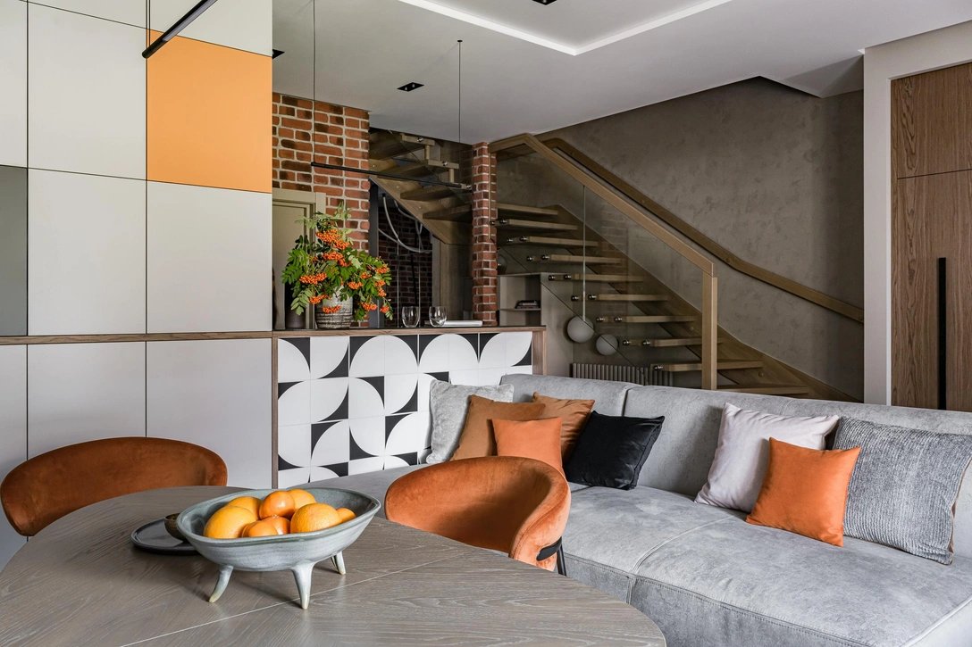 Интерьер строится на сочетании различных фактур. Стены покрыты декоративной штукатуркой сложного серого оттенка и дополнены деревянными панелями с подсветкой. В ТВ-зоне организованы места для хранения, спрятанные за гладкими фасадами в цвет стен. Кухонные фартук и барная стойка облицованы плиткой с черно-белым геометрическим принтом. Разбавляют общую палитру деликатные оранжевые акценты.