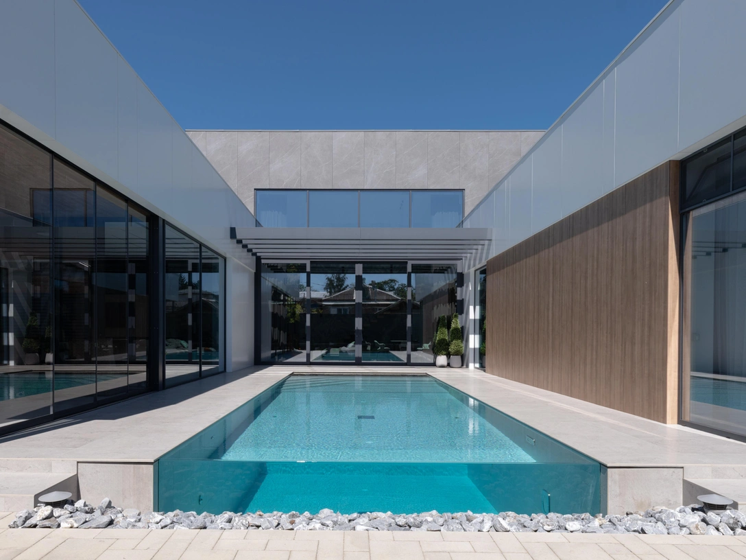 Дом имеет П-образную форму. В центре находится общая зона со вторым светом, а по бокам примыкают приватный блок со спальнями и полноценная SPA-зона. Одним из смысловых центров стал закрытый внутренний двор. Здесь главную роль играет переливной бассейн со стеклянной гранью, создающий эффект «воды вне гравитации».