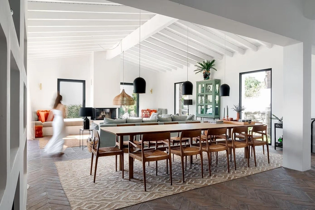 В столовой поставили длинный деревянный стол, подходящий для камерных ужинов и для посиделок большими компаниями. Три подвесных черных светильника задают ритм, а вместо выступающих стеллажей архитекторы сделали ниши со скругленными краями, напоминающие типичные для этого региона открытые полки в «мазанных» штукатуркой стенах.