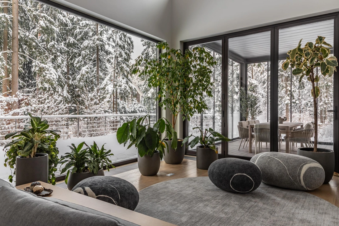 Диван, Boca room. Пуфы-камни, Katsu. Подвесной свет, Flos. Ковер, Ragolle. Подушки, декор, Izzy Decor. Деревья и прочие комнатные растения, кашпо, RoNi Green house. Краска во всех помещениях, Derufa.