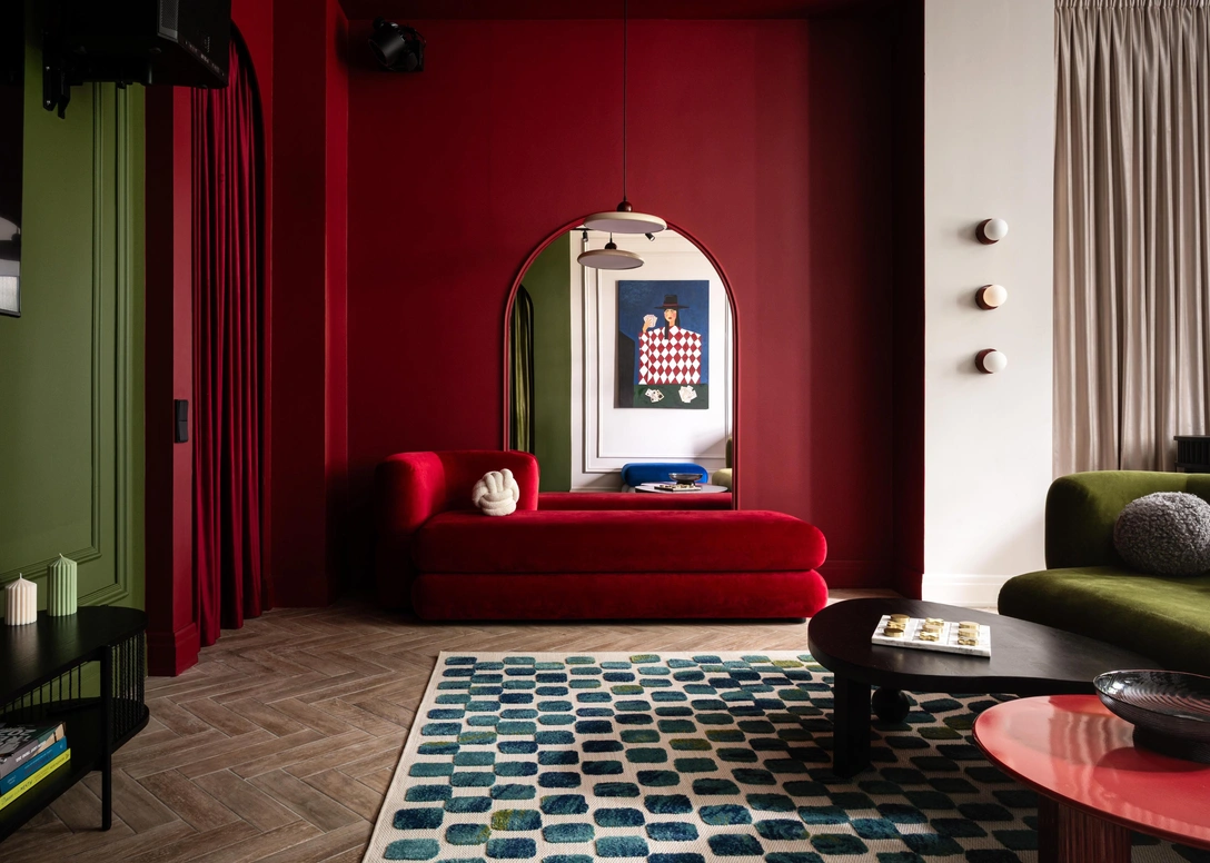 Основными цветами выбрали насыщенный бордовый и лаймово-зеленый. Эти оттенки переходят со стен на потолок, формируя геометрический рисунок, который завораживает и привлекает внимание.