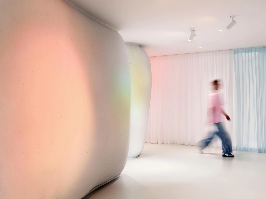 Чтобы отойти от ассоциаций с офисом, кабинеты врачей разместили в один ряд по оконной линии. Колонны в общей зоне замаскировали с помощью объемных биоморфных конструкций обтекаемой формы. Такой подход позволил избежать глухих коридоров и тупиков, организовать в центре уютные зоны для общения и расслабления, а также сформировать мягкую, природную эстетику. Благодаря этим «живым» органическим формам, похожим на облака или своды пещеры, пространство, как теплое одеяло, окутывает посетителей.