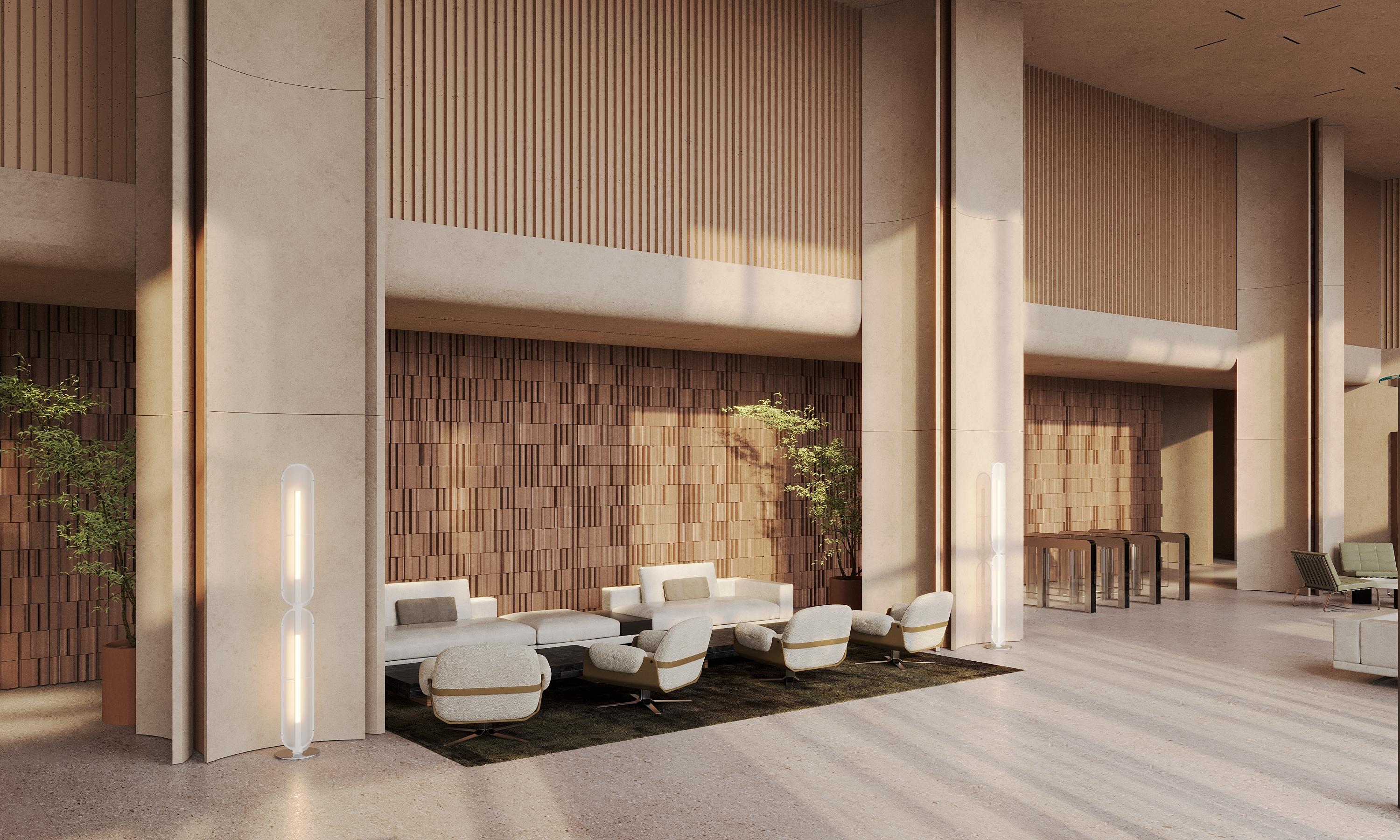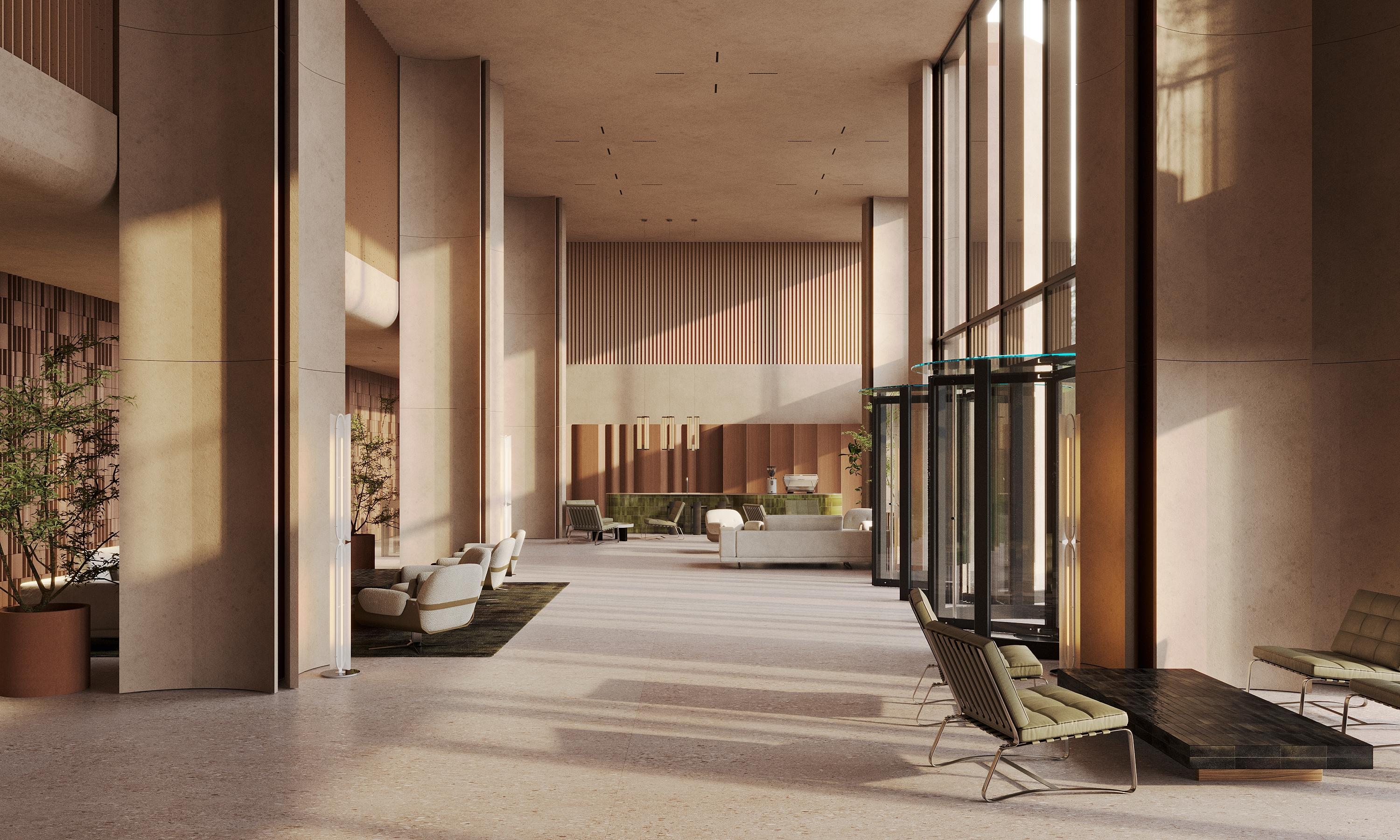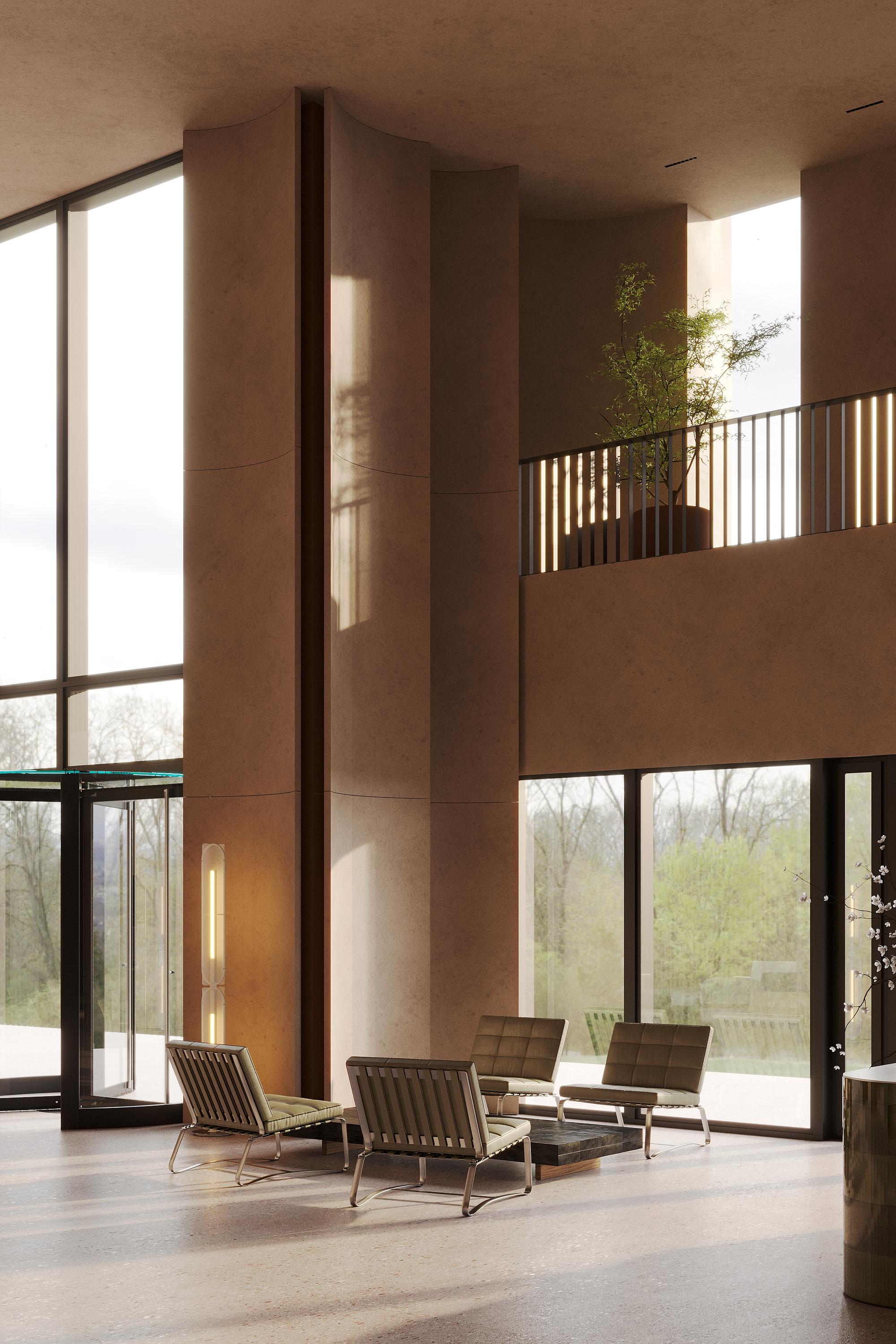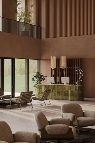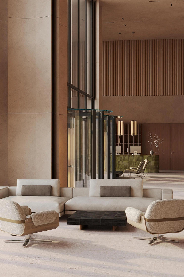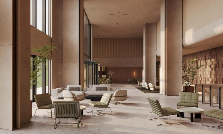 Визуальная и тактильная среда строится на сочетании природных оттенков и мягких фактур, что перекликается с архитектурной концепцией здания, вдохновленной окружающими парковыми территориями. Лобби интегрировано в общую структуру здания и помогает погрузить резидента в атмосферу уюта и вдохновения.