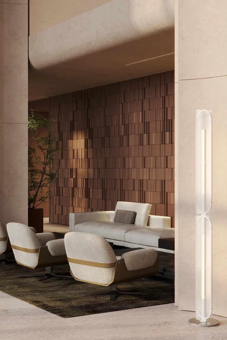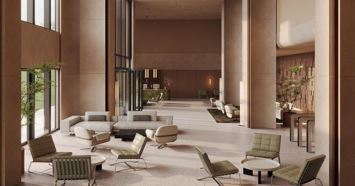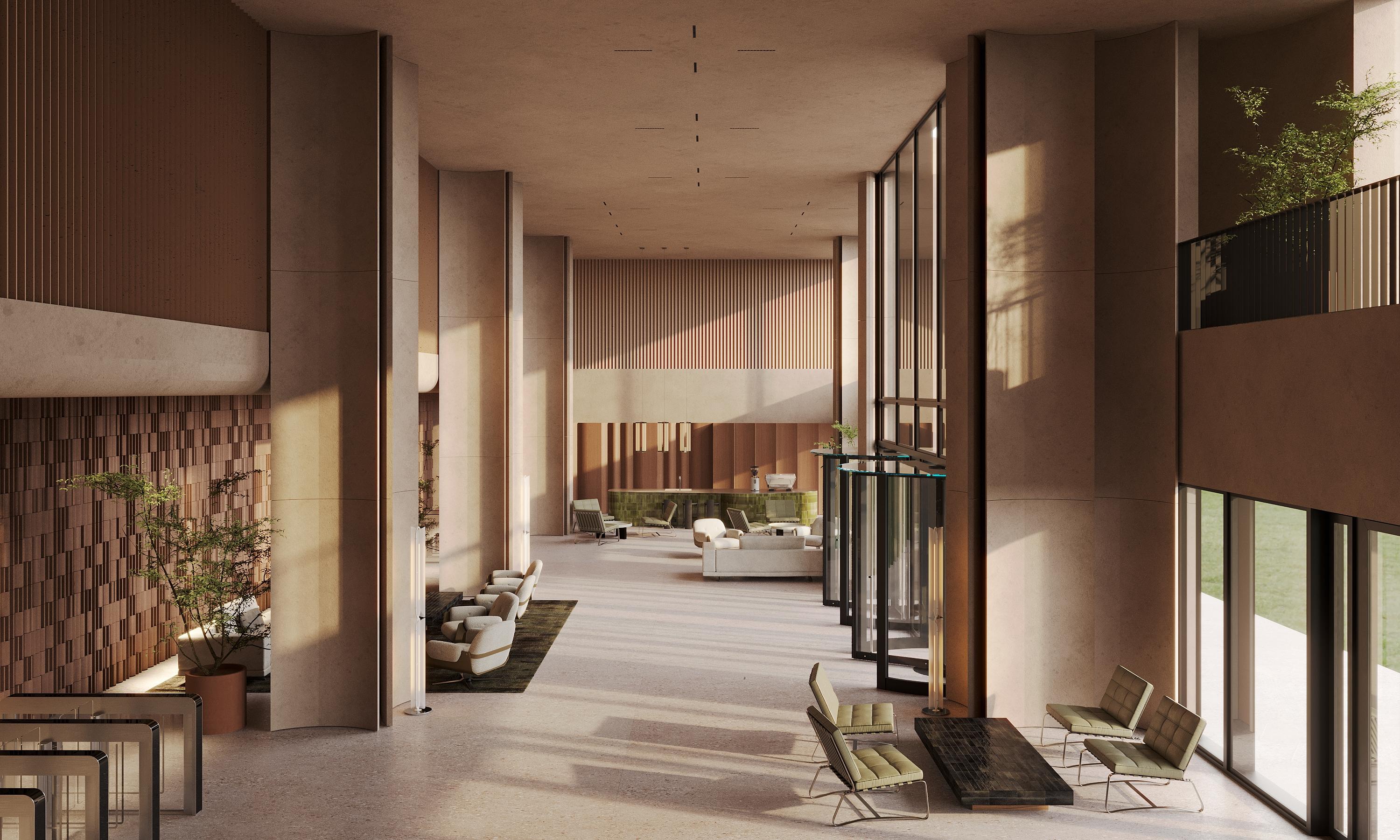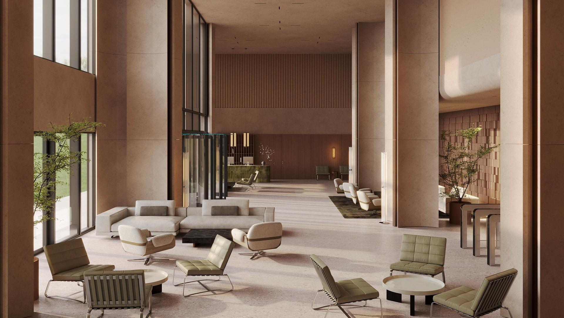 Визуальная и тактильная среда строится на сочетании природных оттенков и мягких фактур, что перекликается с архитектурной концепцией здания, вдохновленной окружающими парковыми территориями. Лобби интегрировано в общую структуру здания и помогает погрузить резидента в атмосферу уюта и вдохновения.