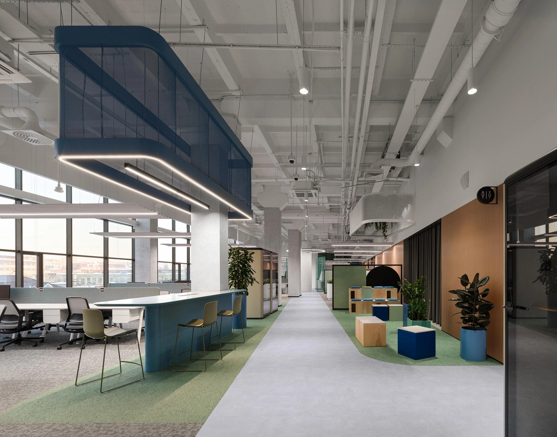 Символом единства и объединения была выбрана линия — чтобы отразить ее в пространстве, мы использовали образ реки, которая «течет» через весь офис и органично связывает его основные зоны: опенспейсы, переговорные комнаты, зоны для печати, кофепойнты, лаунжи, трансформируемые пространства и арт-зоны. Фирменный голубой — цвет воды — дополнен зеленью, теплым деревом и металлическими поверхностями, отсылающим к области деятельности компании.
