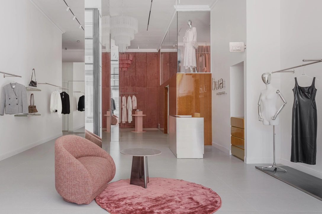 Мы создавали этот бутик для основательницы бренда BUA, она развивает в нем два направления — повседневную и домашнюю одежду. Заказчица хотела, чтобы шоурум был ярким, необычным и запоминающимся, но при этом оставался функциональным и комфортным для клиентов. Конкретных референсов не было — все создавалось интуитивно.
