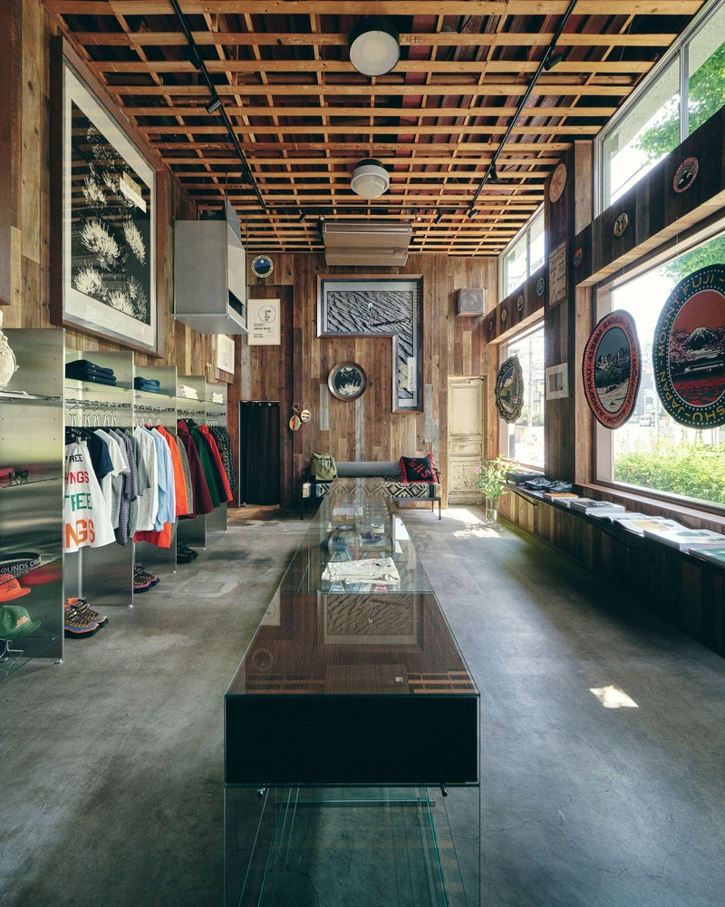 Концепт-стор с фасадом цвета хаки сразу заявляет о своем присутствии среди нейтральных соседних зданий. Полы, стены и потолок шоурума облицованы восстановленной древесиной с выветренной текстурой, которая вызывает ассоциации как с альпийскими шале и с традиционной японской деревообработкой. Литые бетонные полы, минималистские светильники из нержавеющей стали и гладкая стеклянная витрина привносят в интерьеры эстетику лофта.