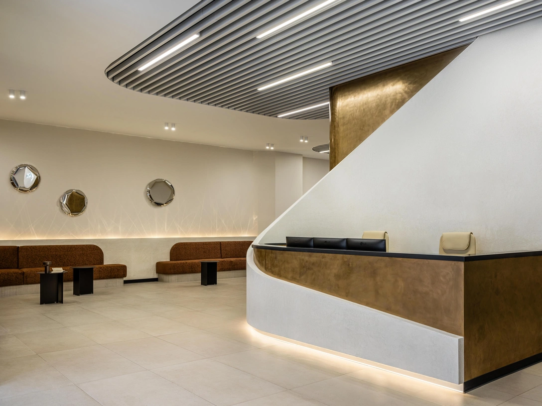Для этого мы просчитали все до миллиметра, особенно тщательно работали с пластикой ресепшена — стойку будто обнимает плавная ниспадающая линия. Это довольно сложный в исполнении элемент, но команда справилась отлично. Пропорции и высота мы выстраивали сначала с помощью макета из оргалита, потом — проекции на полу, а после создали шаблон из ГКЛ.