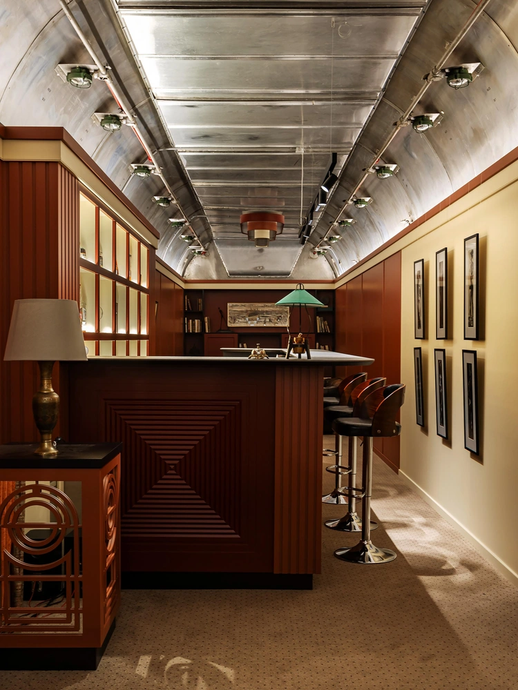 В центре вагона разместился бар с функциональной кухней и барной стойкой. Подсветка шкафа для хранения бутылок создает уютную атмосферу, преломляющийся через бутылки свет игриво приглашает своих посетителей. Напротив бара нашли место картины из личной коллекции заказчика.