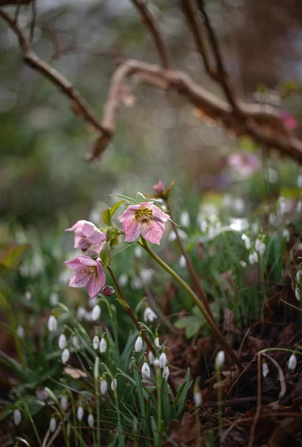 Кроме подснежников в феврале в саду зацвели и другие луковичные: цикламен, хионодокса, зимолюбка и ранние нарциссы. Эту живописную композицию дополняют розовые, зеленые и бордовые морозники, примулы, сердечник пятилистный и крупноцветковый золотарник с крошечными розовато-белыми цветками и серебристыми прицветниками, он хорошо приживается в тени.