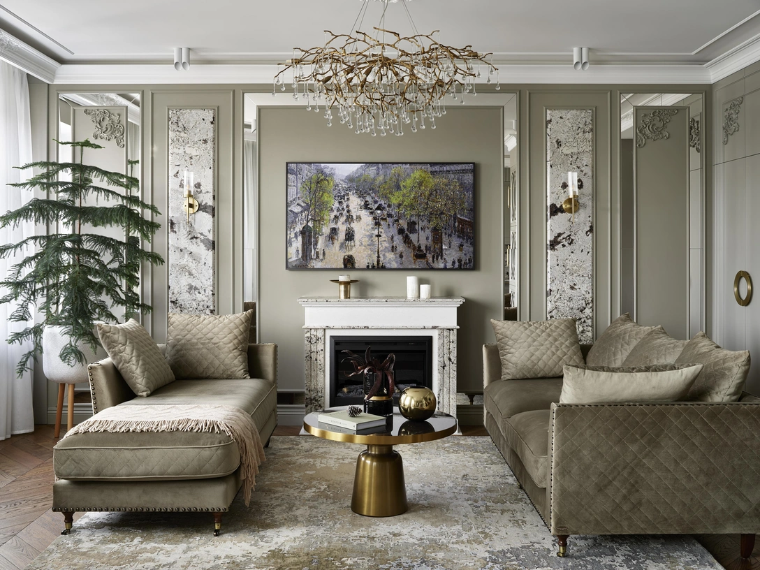 В оливковой гостиной акцентом является декоративно оформленная стена ТВ-зоны с зеркалами и стеновыми панелями из бразильского гранита. В центре — портал с камином, который изготавливали по чертежам дизайнера. Анастасия подобрала для него вьетнамский мрамор и бразильский гранит и повторила это сочетание на кухонном фартуке и столешнице.