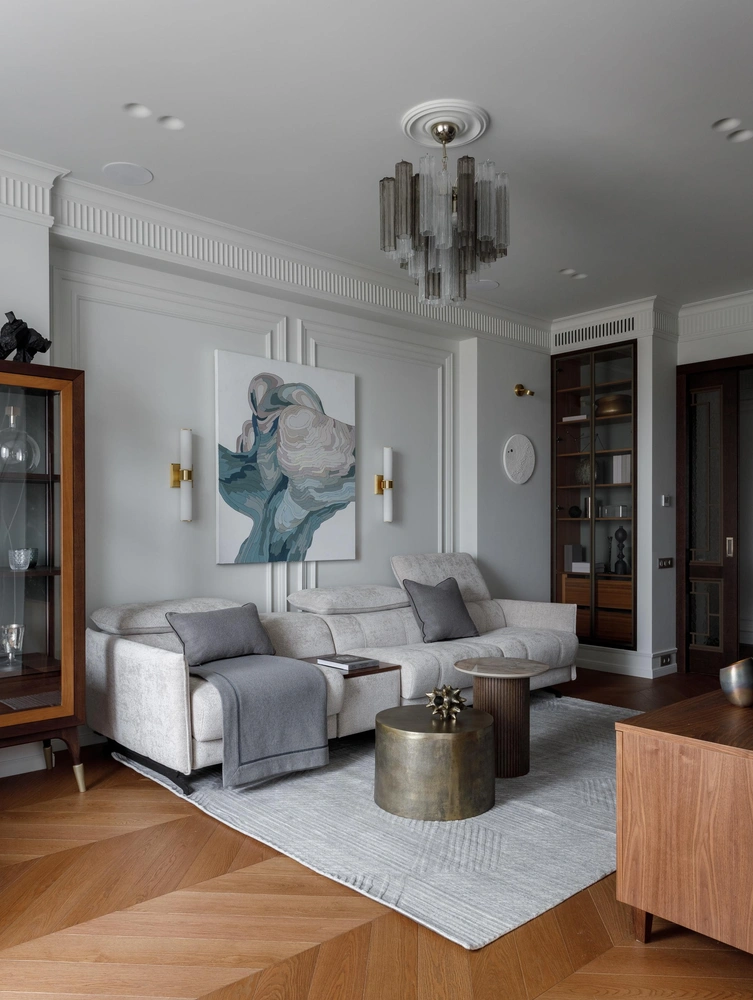 Главной задачей было создать уютную «гостевую» квартиру — альтернативу отелю, но без типичной отельной атмосферы и обстановки. Дизайн построен на балансе противоположностей: теплые оттенки дерева на фоне прохладных стен, основательный мрамор «гриджио оробико» в комбинации с мягкой лепниной, объемные, но парящие шкафы. Благодаря таким контрастным сочетаниям нам удалось создать гармоничное пространство.