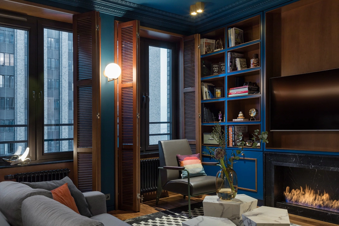 Еще один нестандартный прием — это отсутствие штор, окна забраны деревянными ставнями, создающими особое настроение в квартире.