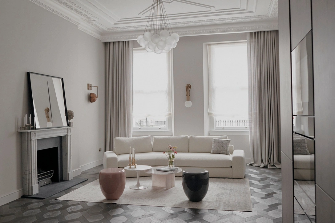Дизайнер выбрала для отделки приглушенные тона, сделав акцент на многослойные текстуры и роскошные материалы, соответствующие сдержанной изысканности Западного Лондона. Были заменены паркетные полы, воссоздан мраморный камин и разработана изящная лепнина потолка, вдохновенная стилем Регентства. Совсем не классическая люстра Cloud от Apparatus Studio создает необходимый контраст с традиционными деталями. Минималистичная кухня скрывает свое функциональное назначение за лаконичными фасадами и не отвлекает внимание от современной обстановки гостиной. Комфортный диван дополняют игривые табуреты и разные столики. Зеркало с графическим эффектом над камином напоминает об абстрактной живописи. Обеденный стол и стулья от Christophe Delcourt образуют своеобразную скульптурную группу.