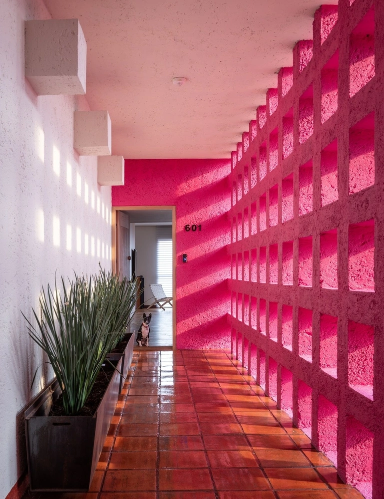 Жилой комплекс Antigua был построен в районе Санта-Фе в Мехико известным мексиканским архитектором Рикардо Легоррета (Ricardo Legorreta) в 1990-е годы. Он стоит на зеленом холме и сразу привлекает к себе внимание, благодаря фасадам зданий цвета охры с ярко синими и розовыми вкраплениями и высотке цвета терракоты. Именно в ней и находится эта квартира, над интерьерами которой работал дизайнер Алехандро де ла Вега Сулуэта (Alejandro de la Vega Zulueta) из студии Estereotomia.