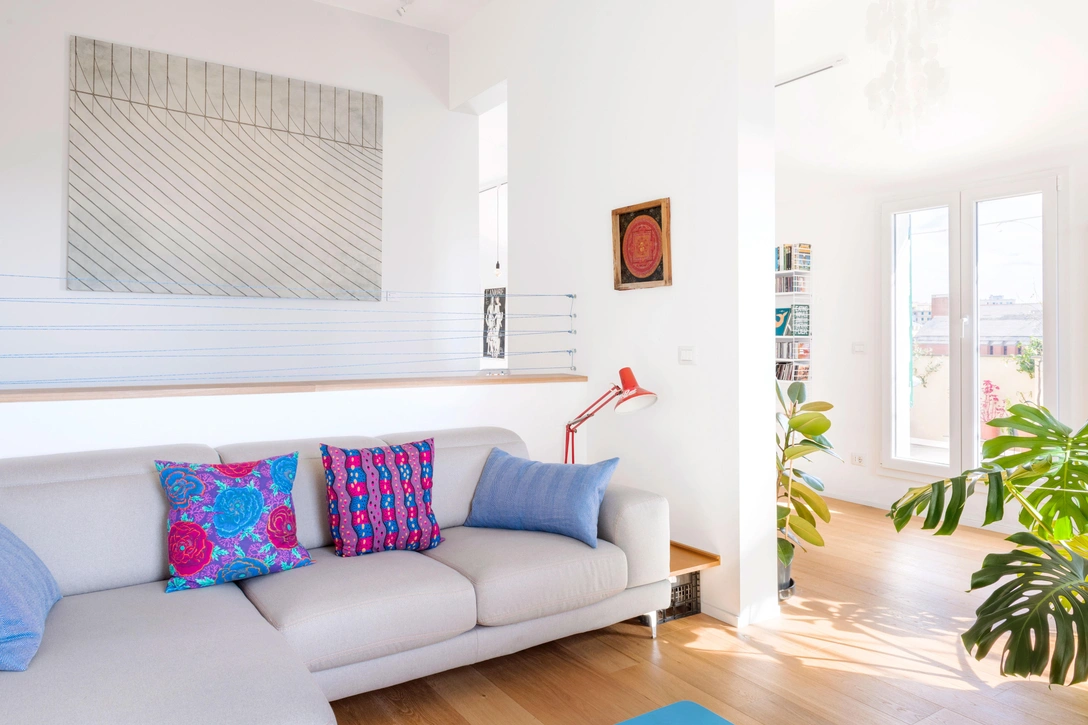 Изначально апартаменты представляли собой две отдельные квартиры, которые команда объединила с помощью деревянной лестницы, дополненной веревочными перилами и иллюминатором. На нижнем этаже расположились две спальни, кабинет и санузел. В комнатах сохранились оригинальные полы из терраццо, а в основной спальне можно увидеть арочное окно и слои старой штукатурки.