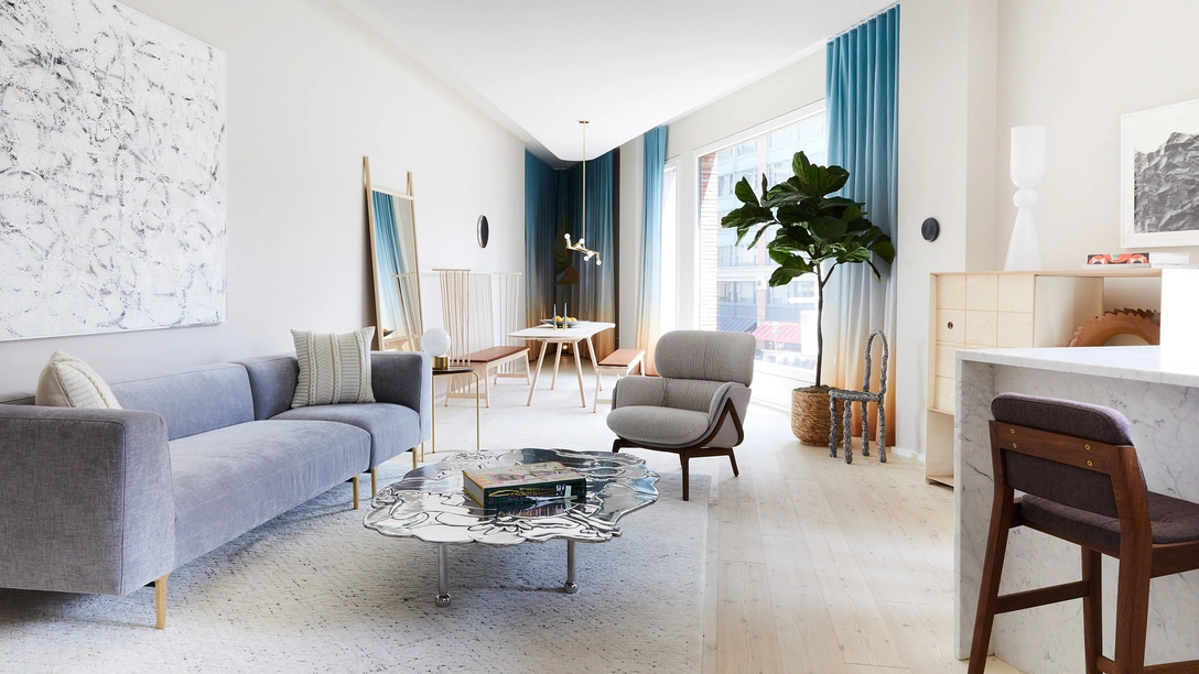 В новом здании, построенном по проекту архитектурного бюро DDG, размещаются десять двухэтажных квартир, а также два двухуровневых пентхауса. Для оформления демонстрационных апартаментов пригласили португальский мебельный бренд De La Espada и галерею The Future Perfect. Совместными силами они создали очень светлый и воздушный интерьер с расслабленной атмосферой.
