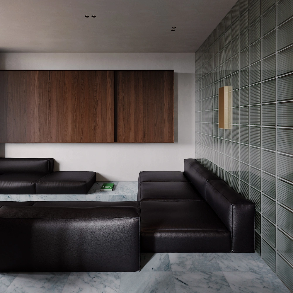 Чтобы обеспечить приток естественного света в каждой комнате, ванная стала частью приватной зоны, а гостевая комната была отделена от гостиной стеклянными блоками и светлым полупрозачным занавесом.