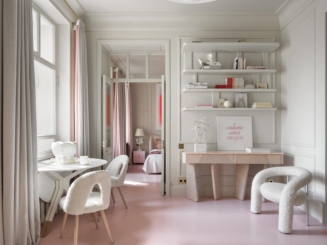 Еще на стадии утверждения планировки Прохор предложил сделать розовый паркет и отобразил это в эскизах. Заказчики удивились и даже, как нам показалось, испугались. Прошло какое-то время, ремонт уже был процессе, и мы утверждали визуализации — с обычном цветом дерева на полу. Но, оказывается, заказчики не собирались отказываться от розового и сами нам про него напомнили, просто им требовалось время, чтобы принять этот оттенок.