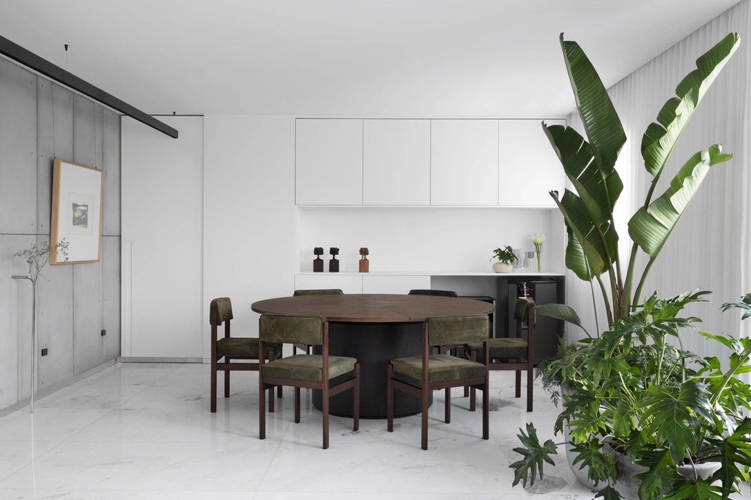 «В этой части квартиры мы хотели создать единое пространство, создав полную воздуха минималистскую атмосферу, усиленную использованием белого мрамора на полу и бетонных плит на стене гостиной», — рассказывает архитектор.