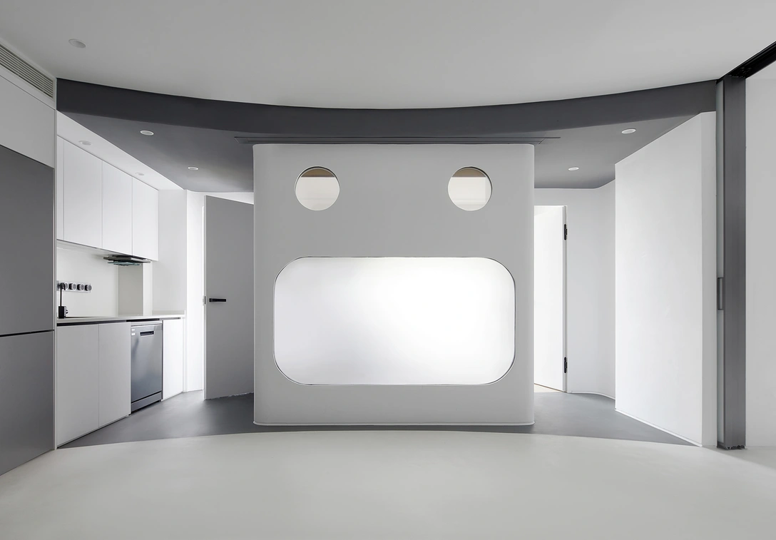 Схематичные изображения лиц, напоминающие детские рисунки, давно используются современными художниками. И даже Пикассо как-то сказал, что хотел бы «рисовать как ребенок». В этой пекинской квартире тоже появилась забавная рожица, но не в виде рисунка или панно на стене, а как часть архитектурного решения. Дизайнеры студии XIGO Studio оформляли пространство, которое строилось для детей, так что игровой дизайн и неожиданные решения встречаются здесь буквально на каждом шагу.