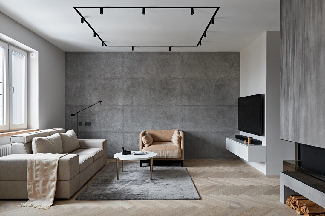 Основная идея проекта: сочетание грубого, брутального бетона с изящными элементами декора