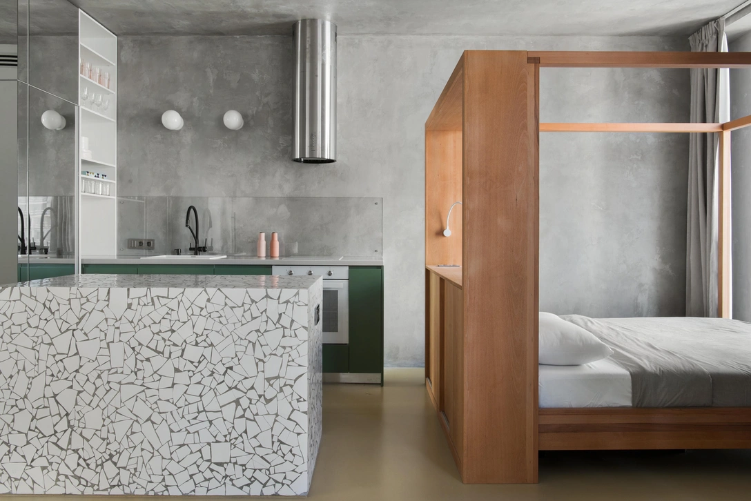 «В квартире нет ни одной перегородки, только ванная скрыта за фасадами шкафа. Чтобы визуально расширить пространства, мы использовали максимально однородные текстуры. Все стены и потолок декорировали штукатуркой под бетон, а пол сделали из полимерного материала оливкового оттенка. В интерьере не видно границ материалов и плиточных швов, которые бы зрительно дробили его на несколько частей».