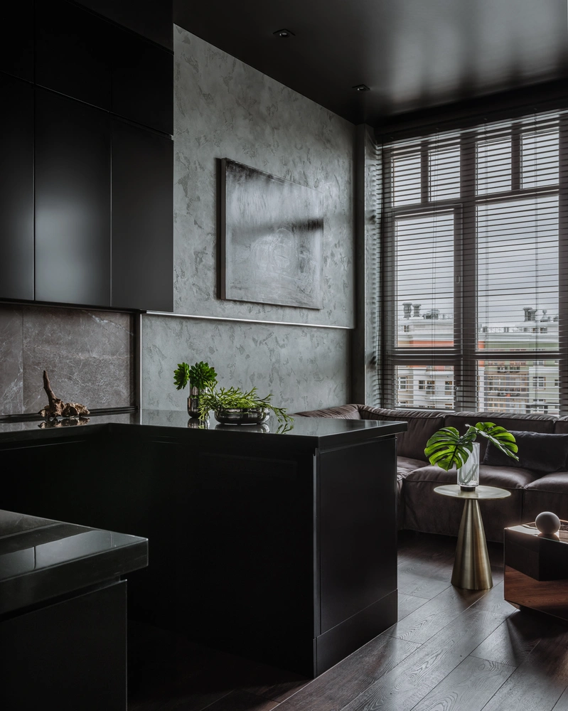 Это холостой молодой человек, любитель быстрой езды и острых ощущений. Он имеет основную недвижимость в Санкт-Петербурге, но работает по контракту в Москве. После года, проведенного на съемной квартире, решился на покупку своей. Хотел интерьер в темной гамме, современный и минималистичный.