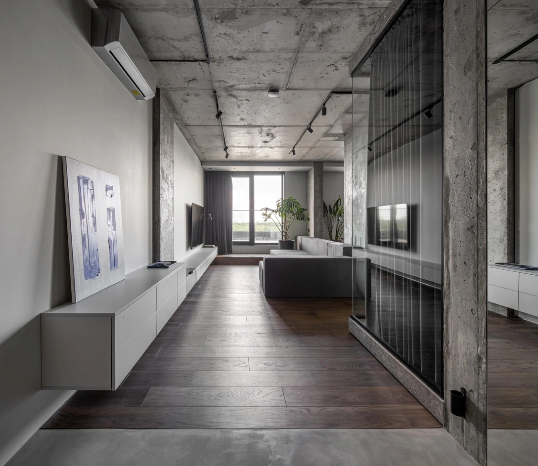 «Во всех соединительных узлах стен, пола, мебели и подиумов применили „теневой“ шов. Потолок и несущие колоны оставили в их изначальном виде монолитного литья от застройщика».