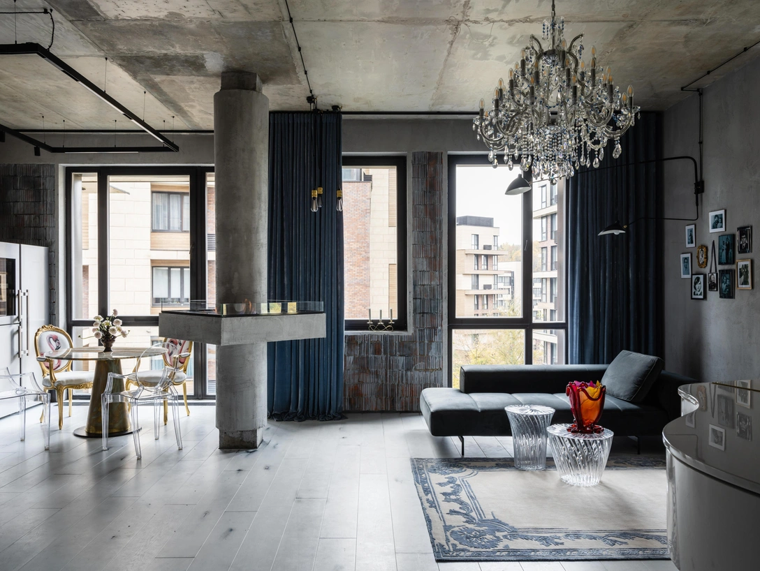 «Главным пожеланием хозяйки было оставить стены и потолок в первозданном виде. Сначала меня эта идея немного напугала, но потом все детали начали складываться в единый пазл, и брутальный бетон довольно дружно ужился с бархатом и розовыми перьями. Все материалы и предметы тщательно избирались и проходили жесткий контроль заказчицы. Здесь нет лишних или случайных элементов».