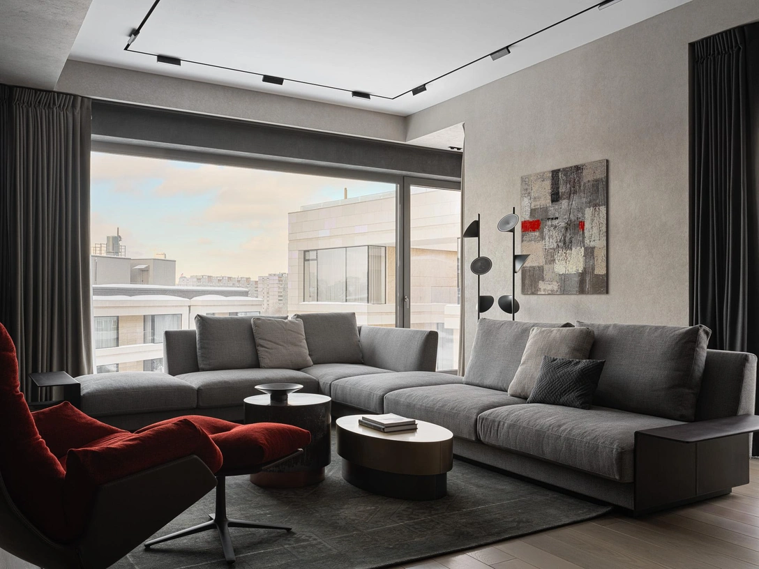 В первую очередь при подборе мягкой мебели мы, конечно же, думали о комфорте. Например, изначально для гостиной мы предлагали другой диван, но заказчик предпочел именно эту модель, так как она оказалась очень удобной. Корпусную мебель при этом мы старались сделать максимально незаметной. Здесь очень много мест хранения, скрытых от глаз, интегрированных в пластику стен. Основная идея такого подхода заключается в том, что шкафы и полки не должны отвлекать нас от общего восприятия помещения.