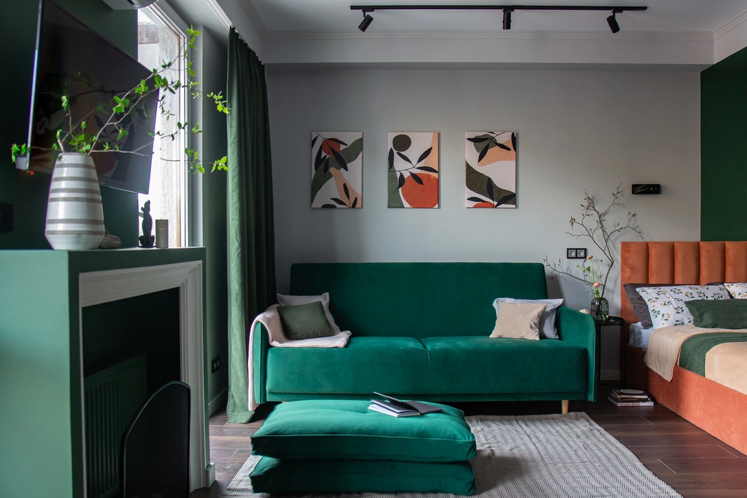Интерьер получился ярким и функциональным. Изначально Наталья переживала, что не удастся сделать достаточное количество мест хранения и при этом не загромоздить все стены шкафами. В итоге все решила довольно большая гардеробная. Она даже позволила отказаться от запланированного вначале комода между кроватью и диваном, что сильно облегчило пространство визуально. Для верхней одежды на крючках есть небольшая ниша при входе.