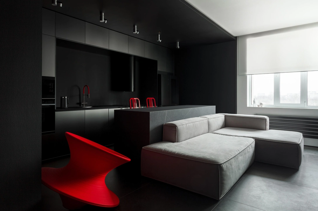 Интерьер оформлен в оттенках черного с акцентами серого и ярко-красного цвета. Потолок и стена, на которой располагается окно в гостиной, сделаны светлыми, что создает приятный глазу контраст и визуально расширяет небольшое пространство.