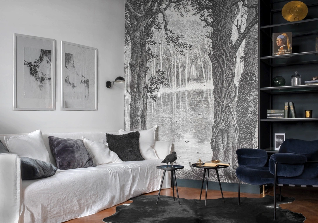 Тот же прием повторяется в гостиной: панорамные обои с пейзажным рисунком приглашают в волшебный лес, продолжением которого становятся живые растения. Предметы под старину — высокий комод и зеркало подчеркивают необычное настроение комнаты. Черно-белые контрасты помогают зонировать помещения. В совмещенной гостиной кухонный гарнитур установлен вдоль стены с окном. Зона кухни выделена черной фактурной плиткой — это решение визуально отделяет функциональную зону от столовой и гостиной.