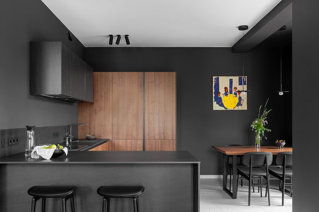 «Планировочное решение, которое удовлетворит и нас, и нормы БТИ удалось нащупать не сразу. Но в итоге все получилось идеально. В квартире нет ни единого коридора. При входе нас встречает просторный холл, проем приглашает пройти в гостиную и примыкающую к ней кухню. Комнаты объединены общим цветовым решением: темно-графитовые стены, светлый пол».