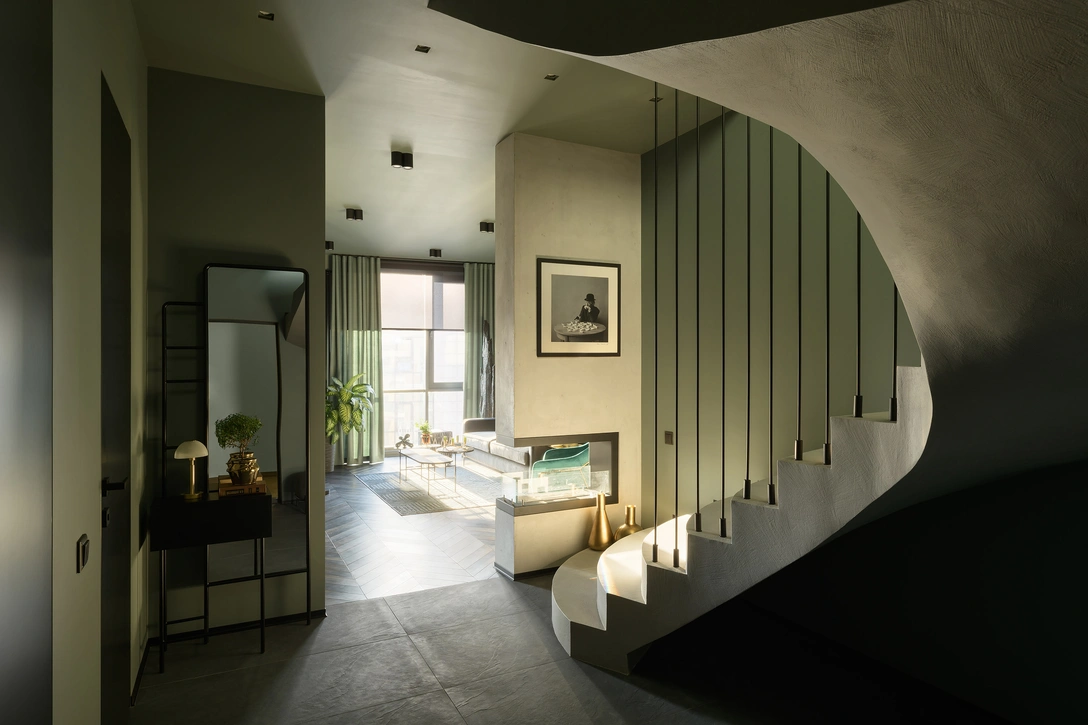 «Зонирование пространства логичным образом определилось уровнями квартиры. Первый этаж отдан под жилую зону: холл, гардеробная, гостиная, кухня. Верхнюю часть заняла большая приватная зона хозяйки: спальня, ванная, гардеробная. Общую и приватную зону соединяет красивая лестница, выполненная из бетона. И с первого, и со второго уровня мы обеспечили попадание на нее дневного света».