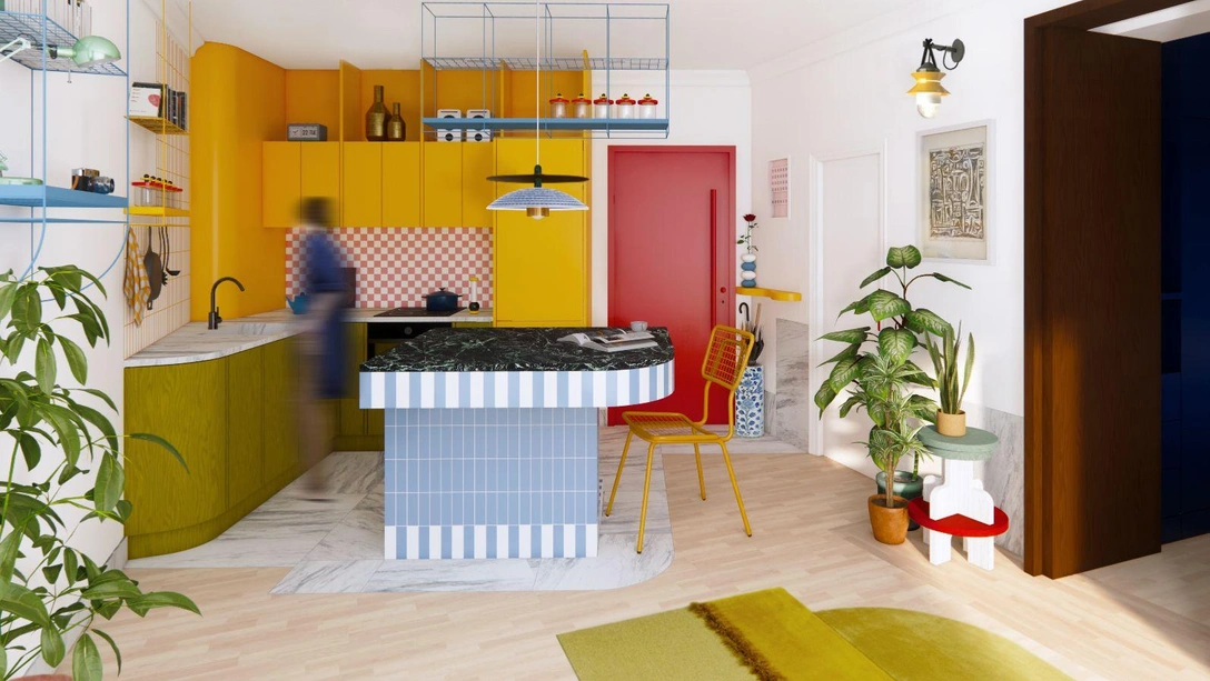 В небольшие размеры помещения дизайнеры вписали кухонный гарнитур с плавными углами, своими очертаниями и расцветкой напоминающий оживленный яркий стиль 1960-х. Кухонный остров со столешницей из темно-зеленого мрамора отделан бело-голубой плиткой. Перекрестной рифмой к цвету плитки и столешницы выступает цвет плафона, в свою очередь дополненный темной пластиной. Элементы декора — вазы, ковер, полки — перекликаются по цветовым сочетаниям с мебелью и отделкой.
