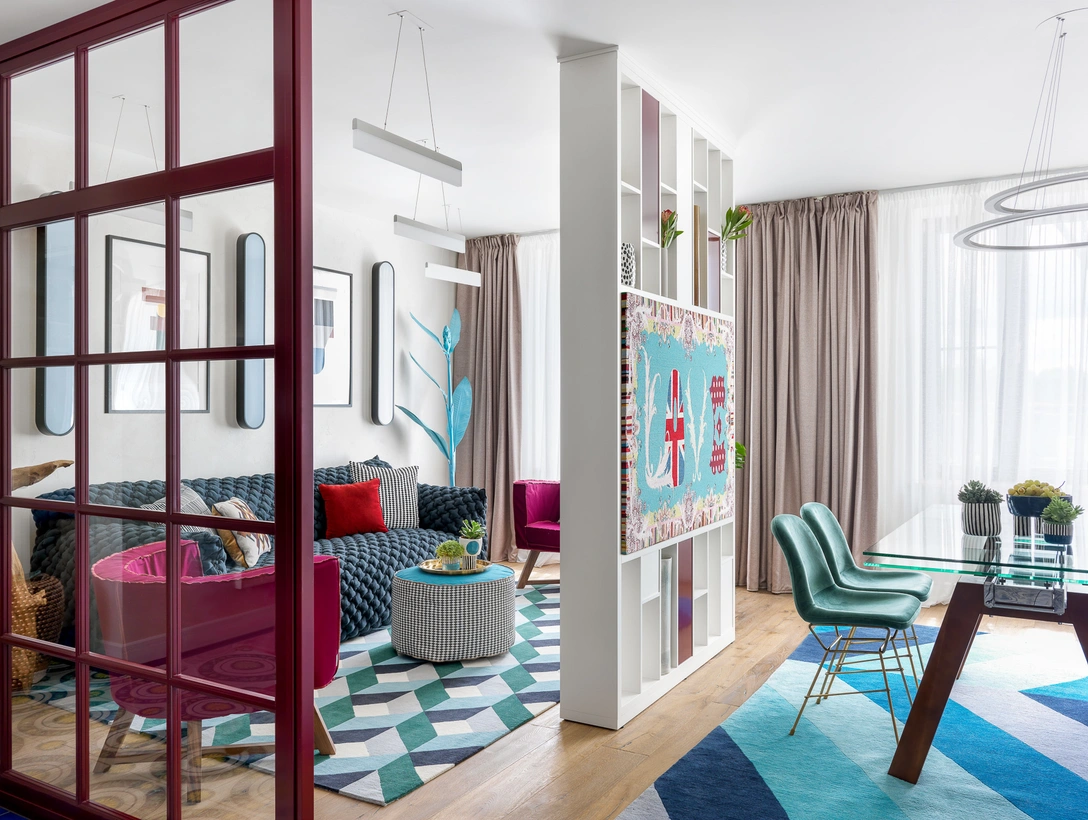 В этой московской квартире заказчики изначально не предполагали проживать постоянно. Молодая пара с новорожденным хотели получить яркий интерьер «на выходные», где также могли бы останавливаться друзья и родственники семьи.