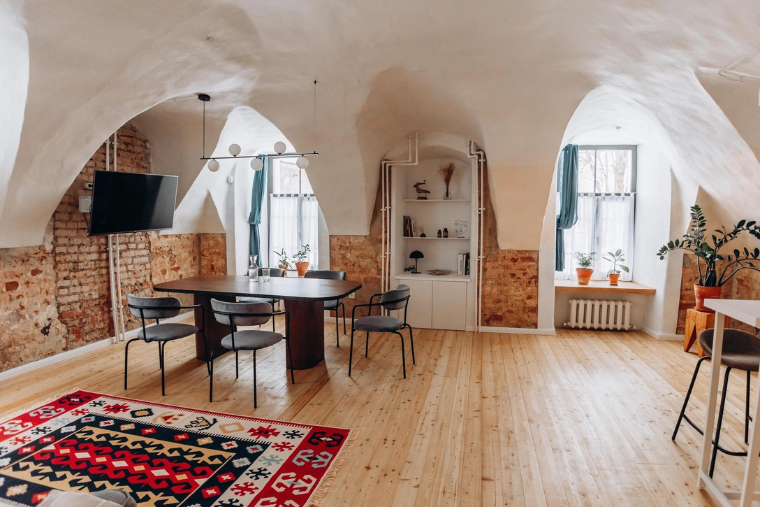 Новая владелица купила здесь квартиру, потому что влюбилась в старинные каменные своды. Идея сдавать ее в посуточную аренду появилась уже в ходе ремонтных работ, которые велись очень бережно по отношению к историческим стенам. Хозяйка и дизайнер Иосиф Брин единодушно решили, что нужно вернуть месту его аутентичный вид.
