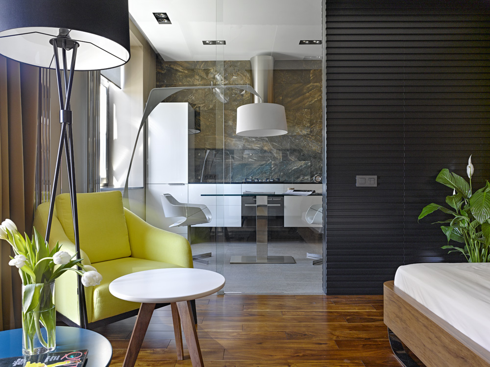 Если для кого-то работа с маленькими пространствами — сущая пытка, то для дизайнера Макса Касымова — одно удовольствие. Например, в своей собственной квартире он сумел на площади всего 1,9 кв. метров обустроить полноценную ванную комнату. Увидев такой проект, будущая заказчица этого интерьера немедленно обратилась к Максу с просьбой оформить свою 34-метровую однокомнатную квартиру. Требований было всего три: вместительная гардеробная, удобная спальная зона и открытая душевая. «Главная сложность в работе с небольшим объемом — найти компромисс между красотой и функциональностью, — говорит Максим. — К счастью, хозяйка этой квартиры не проводит много времени за готовкой. Поэтому мы смогли отказаться от кухонных шкафов верхнего яруса и разместить на стене красивую вытяжку, напоминающую арт-объект».
