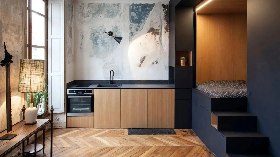 Владелец этой маленькой парижской квартиры, молодой мужчина, сначала не планировал ничего в ней кардинально менять. Он купил жилье, ободрал старые обои и хотел этим ограничиться, не собираясь погружаться в серьезный ремонт. Но пожив там пару месяцев, он понял, что ни обстановка, ни интерьер, ни планировка ему категорически не нравятся. Он обратился к дизайнерам Batiik Studio и попросил сделать пространство более функциональным, оставаясь при этом в рамках небольшого бюджета.