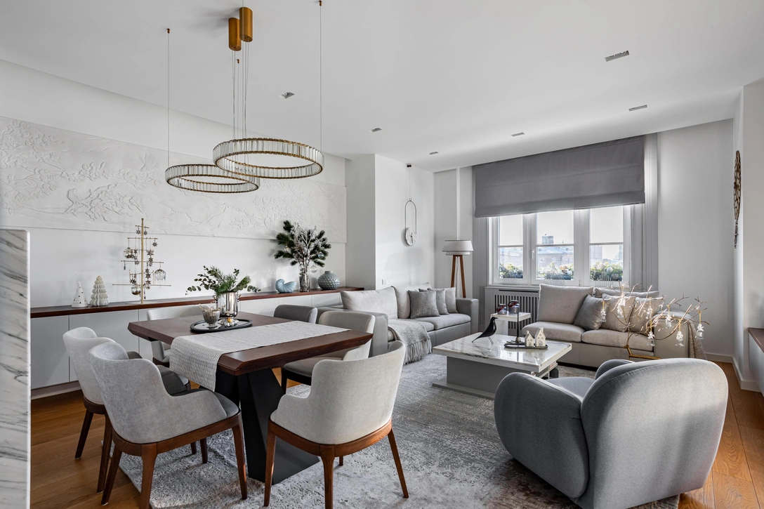 Корпусная мебель в квартире была очень качественная, из натурального дерева, но уже в устаревшей отделке из светло-желтого дуба. Мы решили ее перекрасить. Комоды, обеденный стол и журнальные столики в гостиной тонировали в благородный ореховый оттенок, а также убрали текстуру дерева на фасадах, покрасив их в серый цвет. Обивку стульев и диванных подушек заменили на новую. Два журнальных стола дополнили мраморными топами, что изменило их вид и характер.