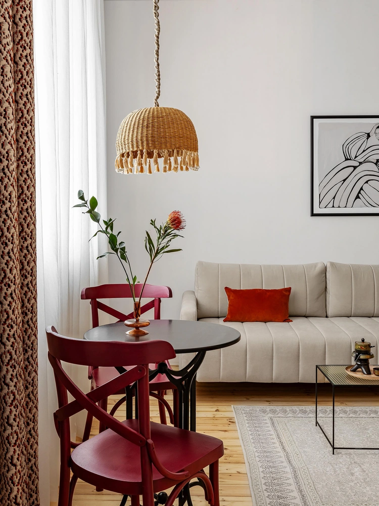Обеденная зона получилась уютной и поэтичной благодаря сочетанию разных материалов и текстур. Небольшой столик дополняют венские стулья, которые мы окрасили в глубокий малиновый оттенок, и светильник из натурального ротанга с забавными хвостиками.