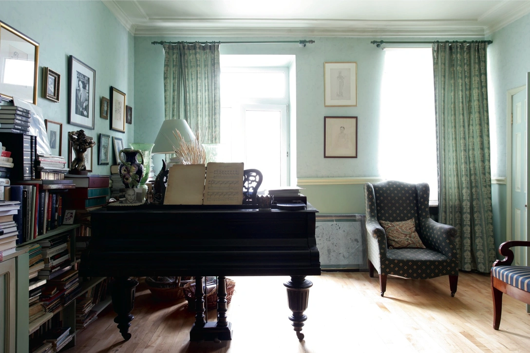 Когда Вульф переехал сюда в начале нулевых, в его распоряжении было не так уж много квадратных метров и совсем мало фамильного антиквариата (хозяин никогда ничего не коллекционировал и не собирал, кроме книг). Но в результате получился какой-то очень английский и очень мужской по стилю интерьер, где светло-изумрудный колер стен удачно совпадает с уютной обивкой вольтеровских кресел и черным лаком рояля. Где коктебельские акварели Максимилиана Волошина идеально гармонируют и с книжными стеллажами, и с матовыми абажурами настольных ламп. В этом доме хотелось жить, приходить сюда в гости, сидеть в гостиной или на кухне, чаевничать и слушать, слушать, слушать…