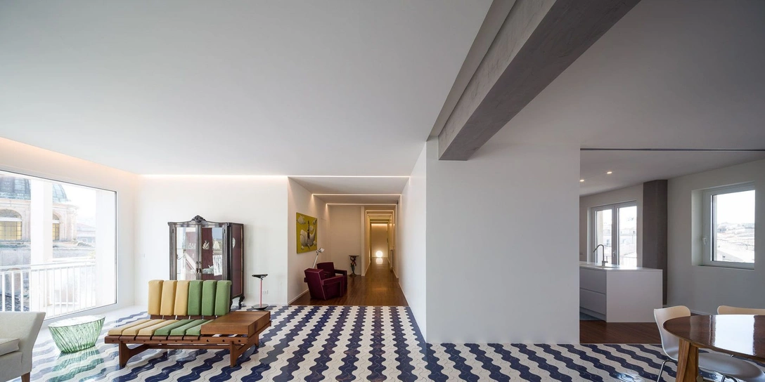 Свободная планировка, много естественного света и воздуха и минимум мебели — с помощью этих нехитрых приемов архитекторам удалось создать цельное и органичное светлое пространство с окнами в пол, из которых открываются великолепные панорамные виды на город. Дневная и ночная зоны отделены друг от друга длинным коридором. А главное украшение этой квартиры — винтажные полы 1950-х гг в гостиной и столовой, выложенные сине-белой плиткой.