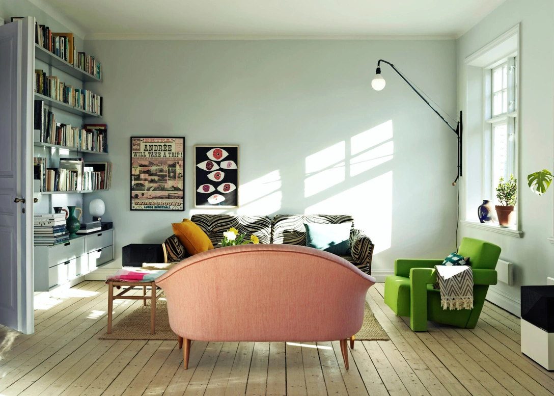 «Для меня дом — это продолжение меня самой, — объясняет София. — Люблю сама выбирать для него мебель. Просто покупаю все, что мне нравится, и собираю вместе. Большой диван в гостиной в обивке-„зебре», например, я нашла на сайте Blocket (аналог нашего Авито) — он невероятно удобный, хотя животные принты не в моем вкусе. Розовый диван приехал к нам из винтажного магазина. Потом оказалось, что когда-то он принадлежал бабушке моей подруги Дженни, и теперь она всегда на нем сидит, когда заходит в гости. Единственный новый предмет в гостиной — это зеленое кресло: мне показалось, что оно идеально сюда подходит».