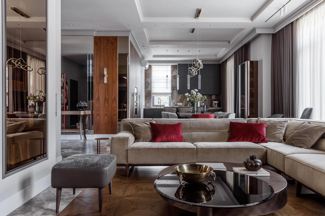 «Заказчики — дружная семья с тремя сыновьями разного возраста, для которой семейные ценности имеют приоритетное значение. Они часто собираются в кругу близких и друзей, сохраняя связь поколений, — рассказывает Ирина Бобровская. — Среди пожеланий хозяев было использовать в интерьере природные фактуры, нестандартные и смелые цветовые решения, не бояться темных оттенков и в целом создать достаточно яркое элегантное пространство без вычурной роскоши».