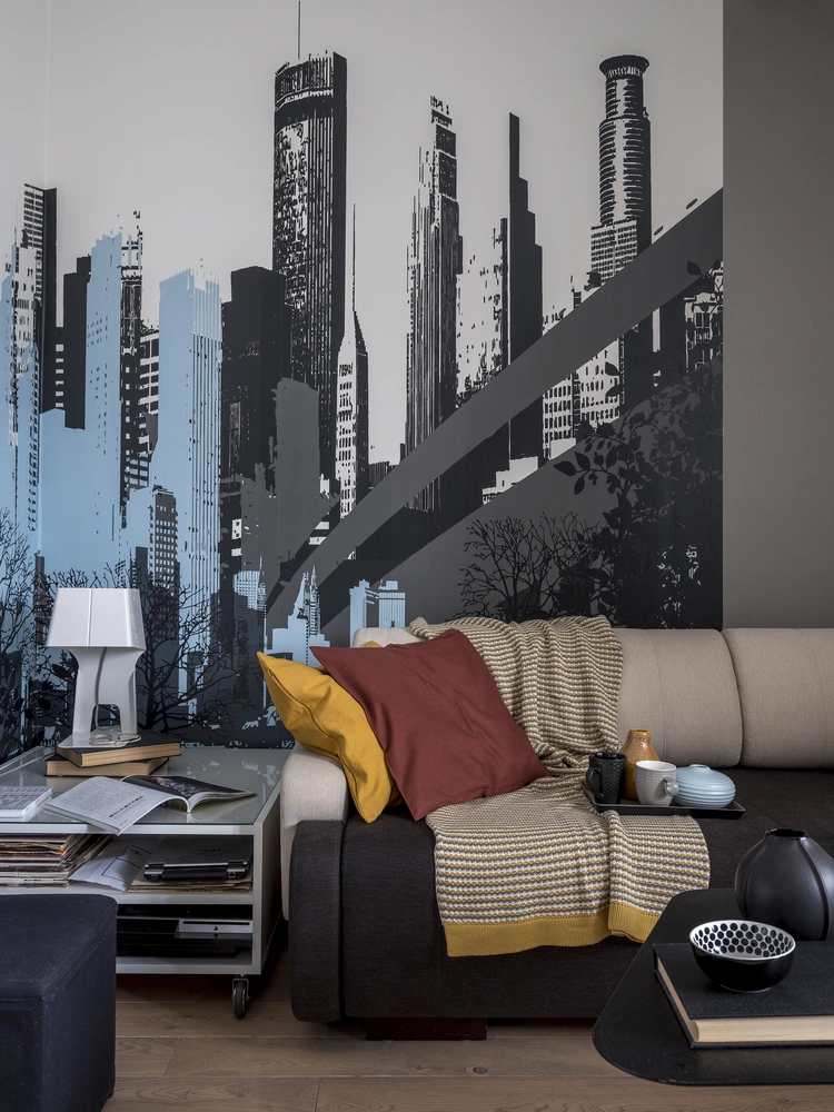 «Палитра насыщенная, цветов много, но они хорошо сочетаются друг с другом и перетекают из комнаты в комнату. Например, красно-оранжевый, цвет лисичек и рябины, который есть в римской шторе на кухне, повторяется в подушках в комнате мамы и в комнате сына. Синий, цвет обоев в маминой комнате, становится светло-синим в кухне и голубым в обоях в комнате сына. Холл, выкрашенный в теплый серый цвет, как бы продолжается в серых обоях в комнате сына и серой обивке дивана в комнате мамы. Строго говоря, в квартире присутствует серый, несколько оттенков синего, голубой, коричневый и песочный в плитке, бежево-розоватый в деревянном полу, белый в покраске дверей и черный в мебели. Не очень замысловатая и разнообразная палитра, но это — фон для ярких тканей, посуды, подушек, плакатов, афиш и литографий, а также ваз и прочих аксессуаров. За очень короткое время, заменив эти мелочи, можно полностью преобразить квартиру».